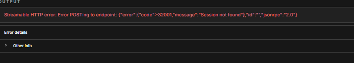 Streamable HTTP error: Error POSTing to endpoint: {“error”:{“code”:-32001,“message”:“Session not found”},“id”:“”,“jsonrpc”:“2.0”}