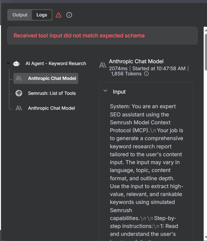 When I connect it to an AI Agent node with Claude, the AI Agent node gives ts error: “Received tool input did not match expected schema”.