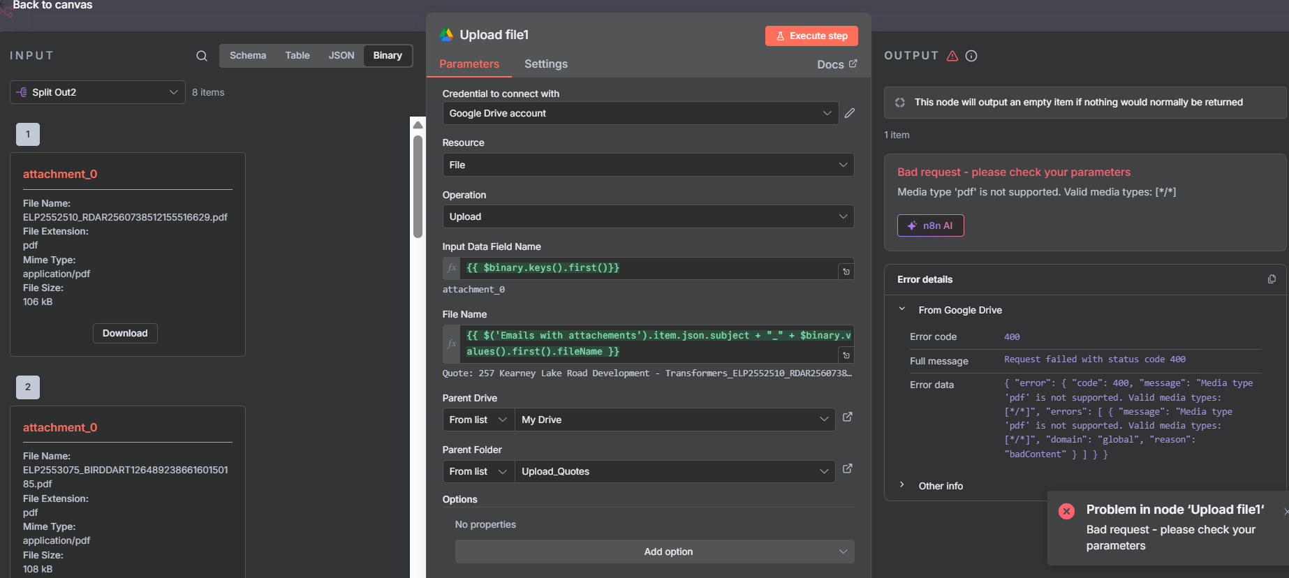 I’m getting a 400 error and media type pdf not supported. I successfully got 7 pdf downloaded from email outlook messages and the first 5 of them come down with mime type : application/pdf just fine but the mime type for the next couple are mime type: pdf and I’m not sure why. I can download them just fine, and they are coming from the outlook trigger the same way. Something isn’t making sense and I am wondering if someone can help me with this? The pdf’s are being outputting from the same software in the same way from the output.