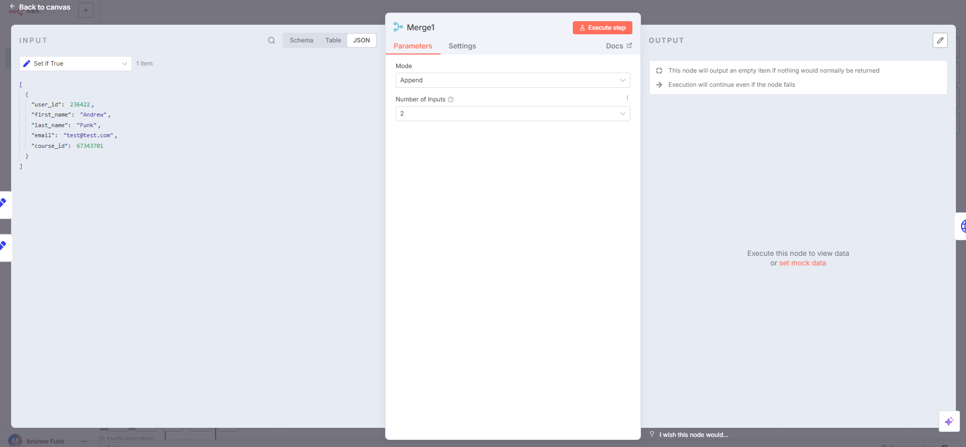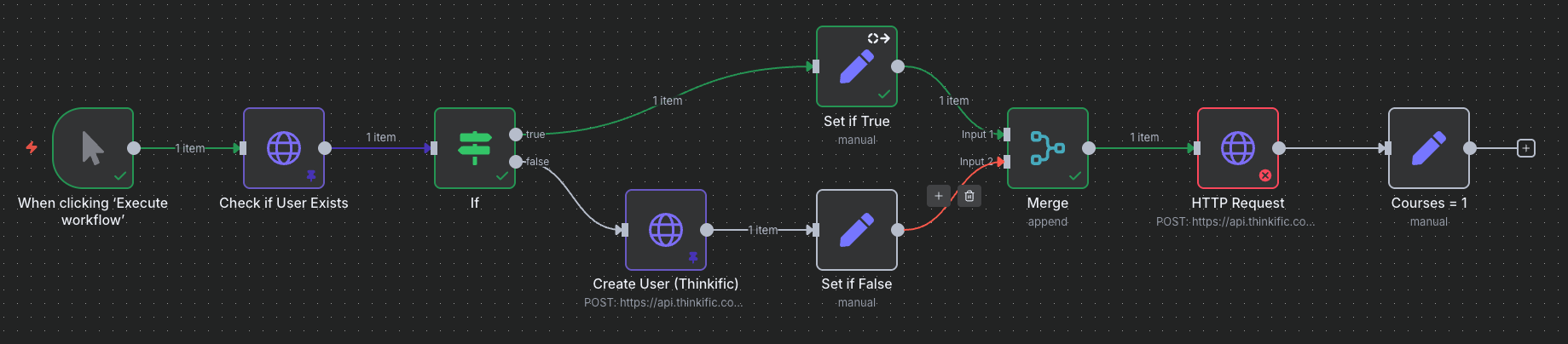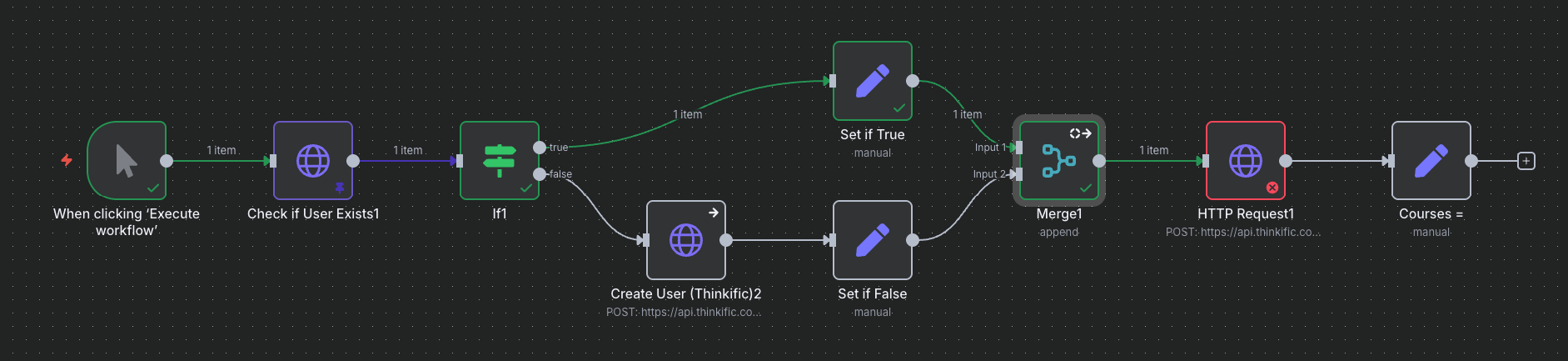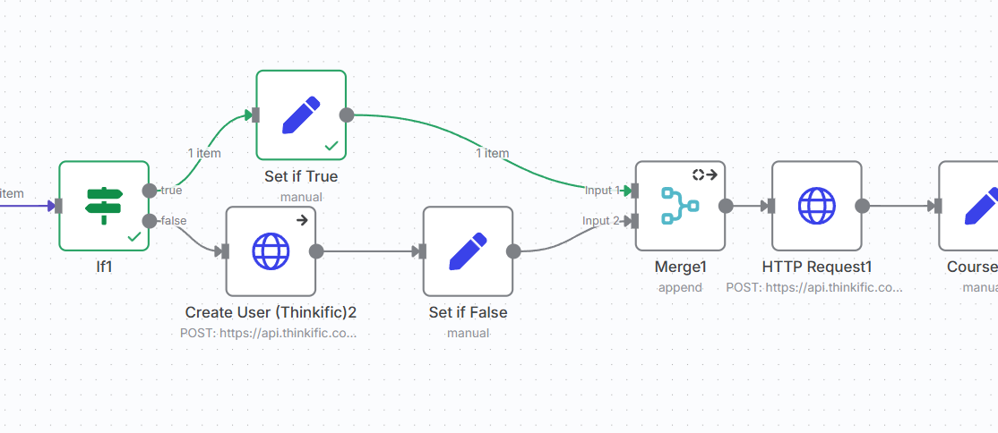 I’m building a workflow to add a student to a class. If the student is not already in our online classroom system I first create the student, then I enroll the Student. To do this all I use an http request node to check if they’re in the system, then an IF node - TRUE if they already exist, FALSE if they aren’t in our system. On the TRUE path I’m using a SET node to assign their student ID to a field, on the FALSE path I’m using an HTTP Request node to Create the student in our system and then SET node to assign the new student ID to a field. Then I want to use a merge field. The problem is only one path will fire after the IF statement, and it looks like my MERGE is waiting for data from the second path. Any idea on what the right approach would be? I tried setting the MERGE node to “Always Output Data” but I’m still not seeing any output when I execute the node.