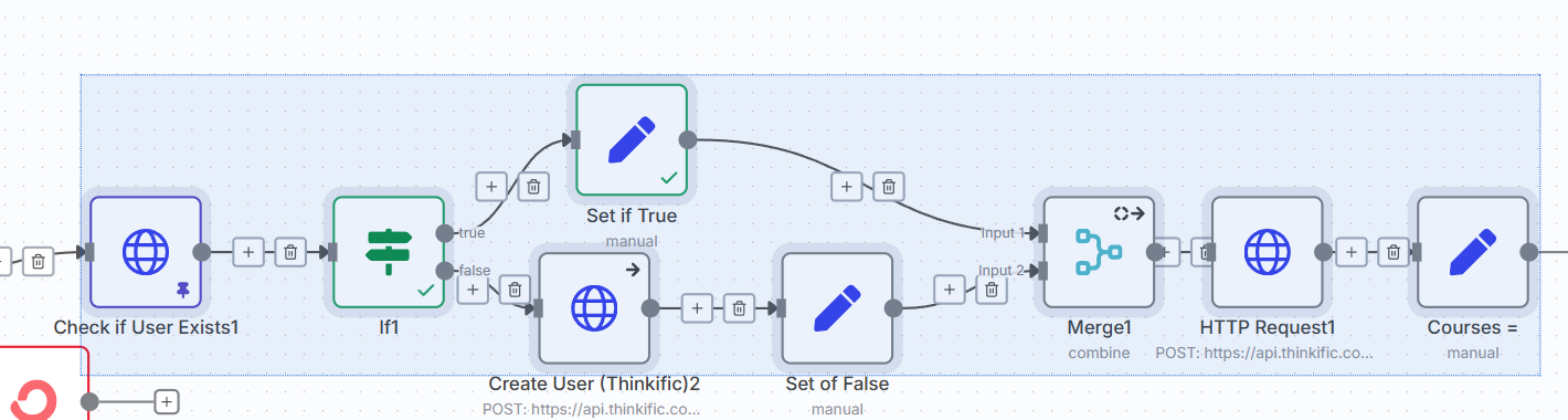I still need to have some type of if statement to get the student ID. I need that field to enroll the student, and I have to get the value either from the Create Student http request or from the Check if user exists mode. That’s why I was trying to use the merge node. Is there a way to use the Variable “student_id” that I created in the SET nodes without referring to the node?