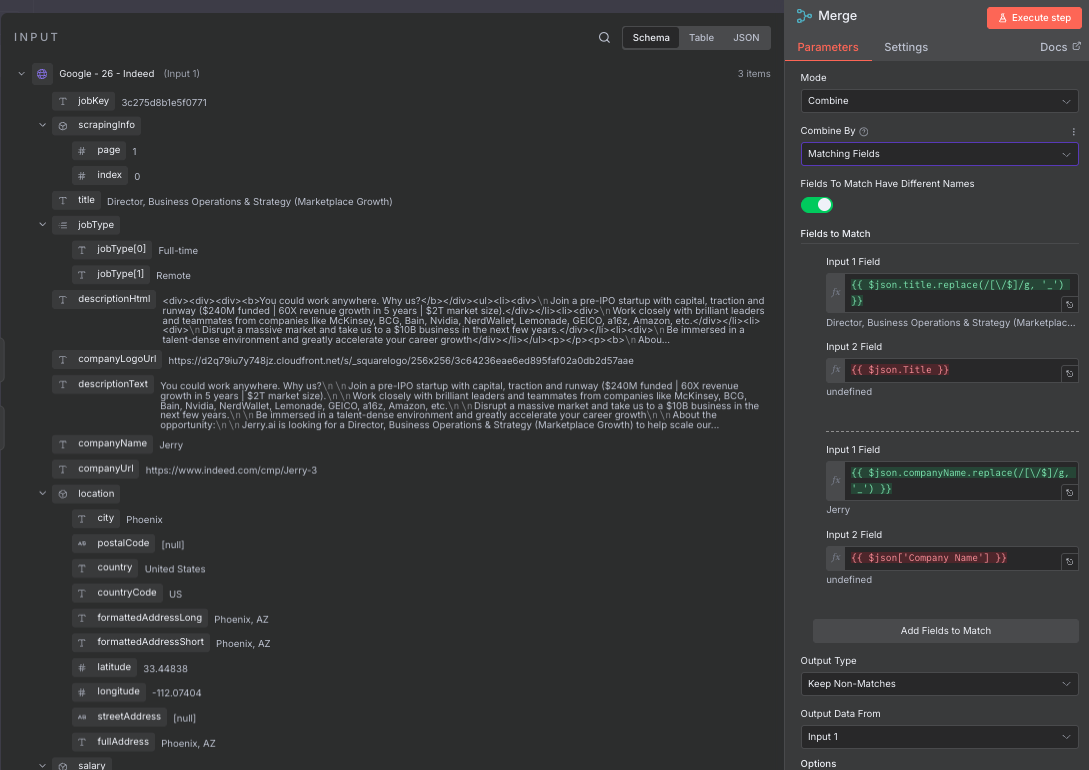 I’m trying to get Merge Combine by Matching Fields with Keep Non-matches to get a list of new items to work from a combination of a HTTP request and a google sheet… it has been working until yerterday. Input 2 is showing the field data as undefined… If I disconnect Input 1 from the node, the Merge node can find the Input 2 data…. but if I reconnect Input 1 into the Merge node, the Input 2 field gets undefined again, thus the merge node does not have data to compare.