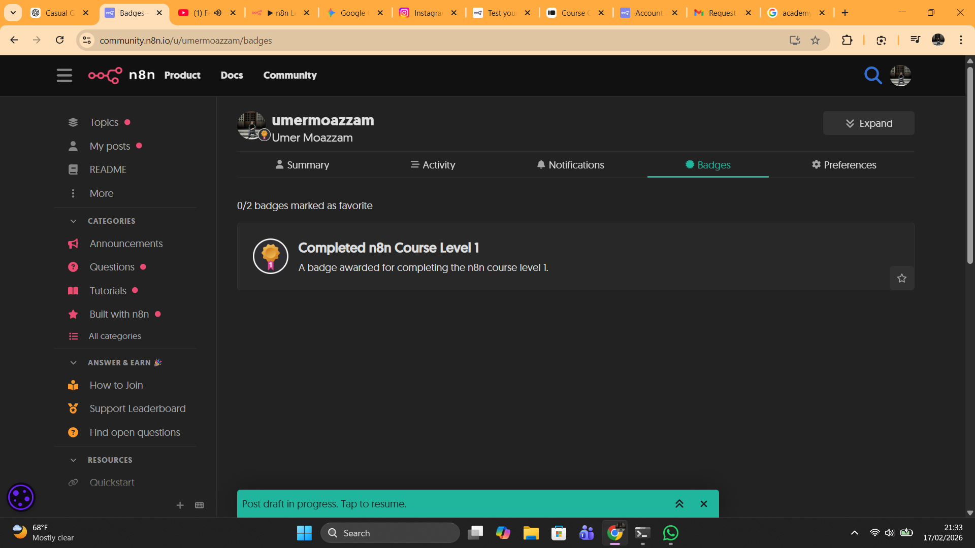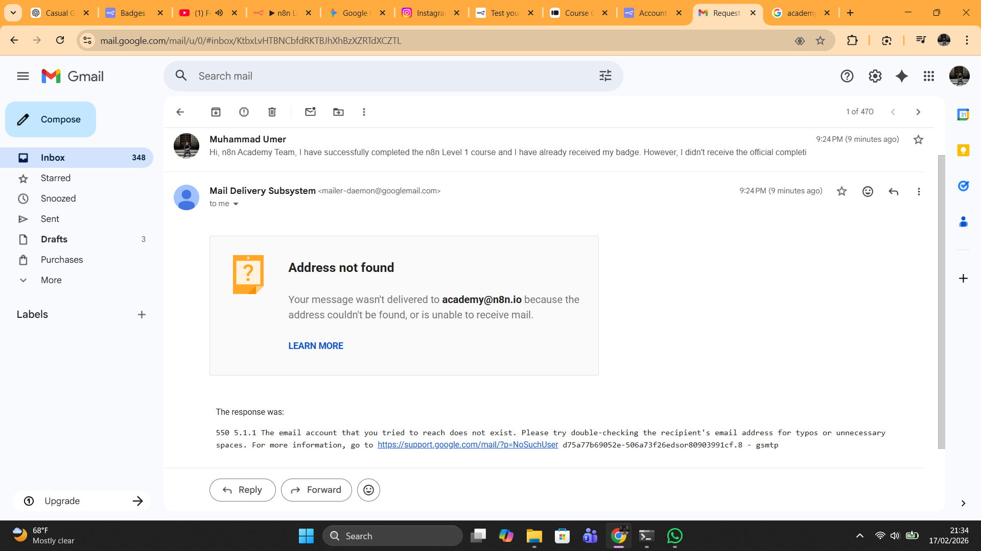 I have successfully completed the n8n Level 1 course and earned my badge. However, I never received the official confirmation email.
