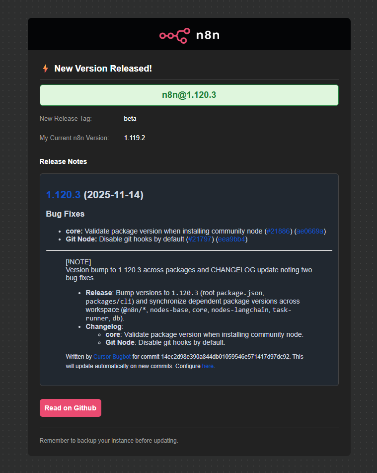 - Sends a styled email notification including the release name, version tag, your current version, and the complete release notes