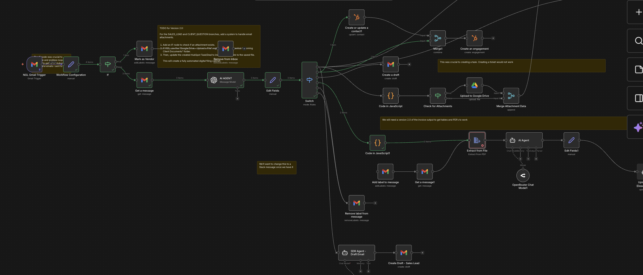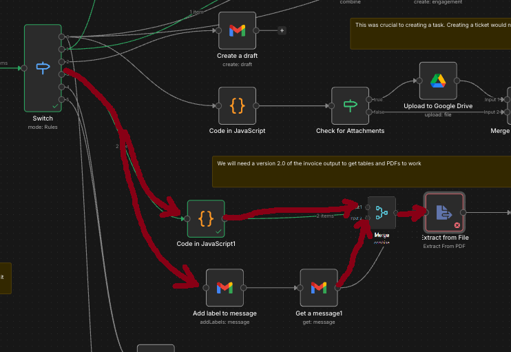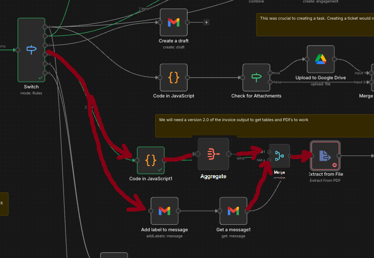 Your new logic created two duplicate attachments called attachment_0 and I still cannot pull either of them through the workflow, I get the same error code. Basically, this workflow runs my email. I’m trying to have this particular path be my ‘Invoice’ path. The email comes through get labeled ‘Invoice’ in Gmail, the pdf is extracted, an AI Agent labels it how my invoices are setup in Quickbooks and gets saved in my Google Drive folder, the message is slacked to me saying I have a new invoice received/to pay and them removes the item from my Gmail Inbox. Maybe my whole setup is incorrect? Would you set it up differently? Hope this clarifies what I’m trying to accomplish.
