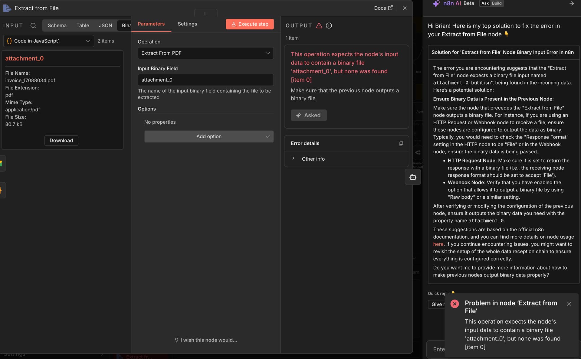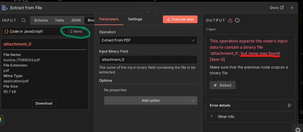 After I move an email through an AI Agent (separating sales leads, client questions, invoices etc), I’m told the PDF from the email will not pass through. When it flows through the switch node to where I need to extract the PDF, I see the binary file, can download it, but when I extract PDF node it says the file is not available or called attachment_0. I see the binary file in the input of the extract PDF node, its called attachement_0, however the node does not recognize it. If tried a merge node, code node, filter, all the same result. Any thoughts?