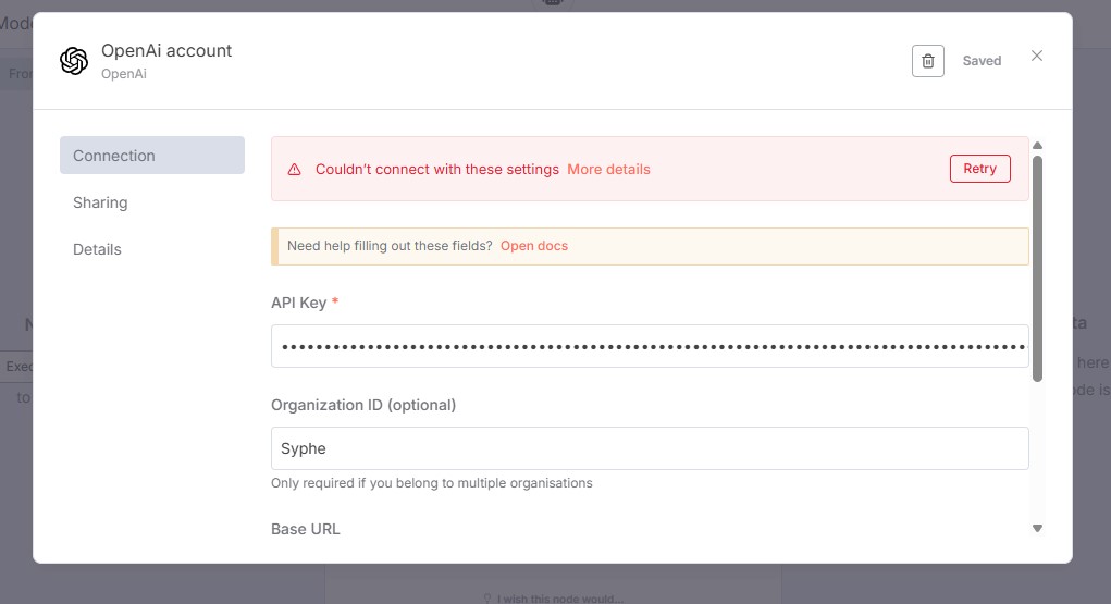 my API key from Open AI fails to connect on my Open AI Chat Model in n8n