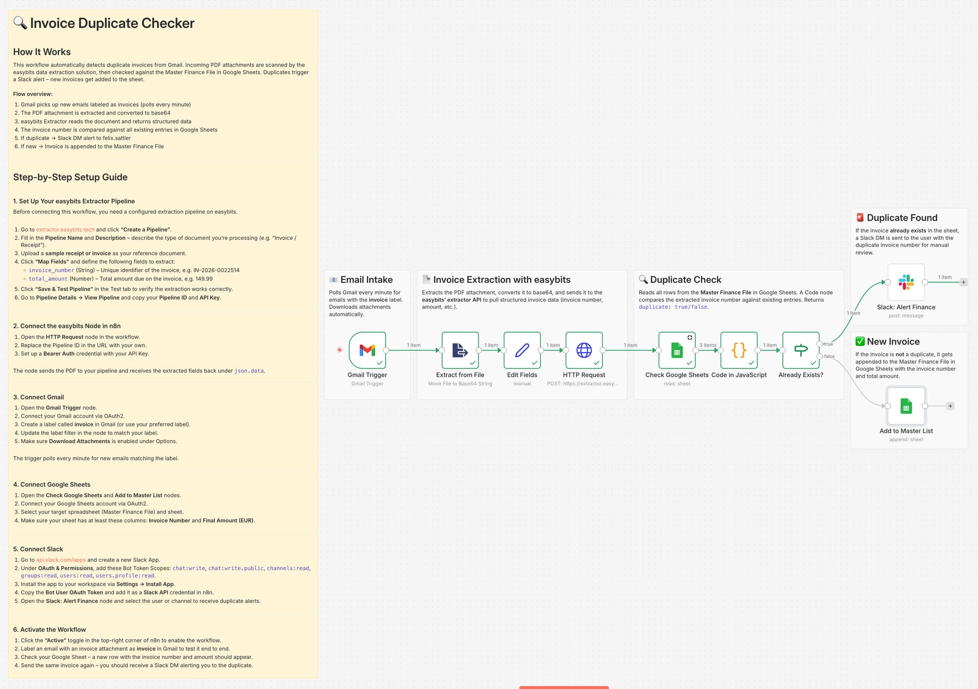 Gmail Trigger (Downloads PDF) → Extract from File (Base64 conversion) → easybits Extractor (Extracts invoice data) → Google Sheets (Cross-checks existing entries) → Code Node (Duplicate detection) → IF Node → Slack DM (Duplicate alert) or Google Sheets (Adds new entry)