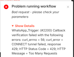 WhatsApp_Trigger: (#2200) Callback verification failed with the following errors: curl_errno = 56; curl_error = CONNECT tunnel failed, response 429; HTTP Status Code = 429; HTTP Message = Too Many Requests