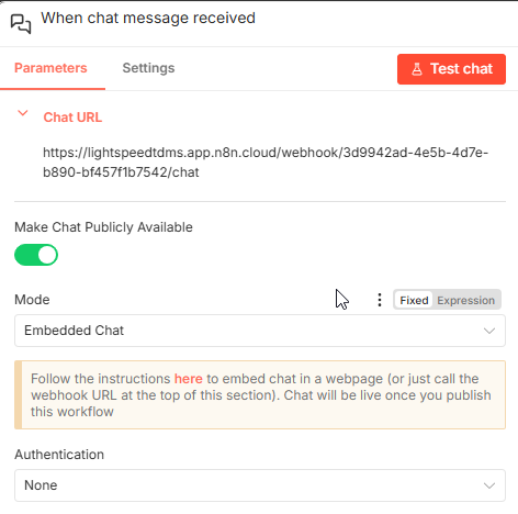 I have addressed this previously, but now some things to checkon AGAIN, your flow should be active, your chat trigger mode must be set to EMBEDDED CHAT & the webhook URL must be correct, and your response mode can be “when last node finishes” so that you actually get a reply. Just let me know what this gives you. If this didnt worked, we gonna move to a different setup. (Also if possible show us your workflow in by pasting the JSON in the preformatted text brackets