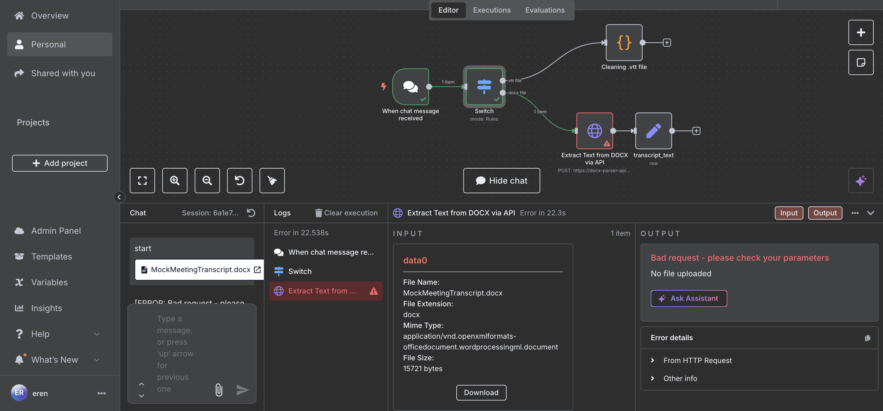 I’m using n8n Cloud and trying to build a workflow that starts with the Chat Trigger node. I want users to upload a file (for example, a .docx document) directly from their computer via chat, and then process the file content in the following nodes.