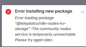 You can install it by typing “@telepilotco/n8n-nodes-kv-storage” in Community Node installation dialog on your self-hosted n8n instance.