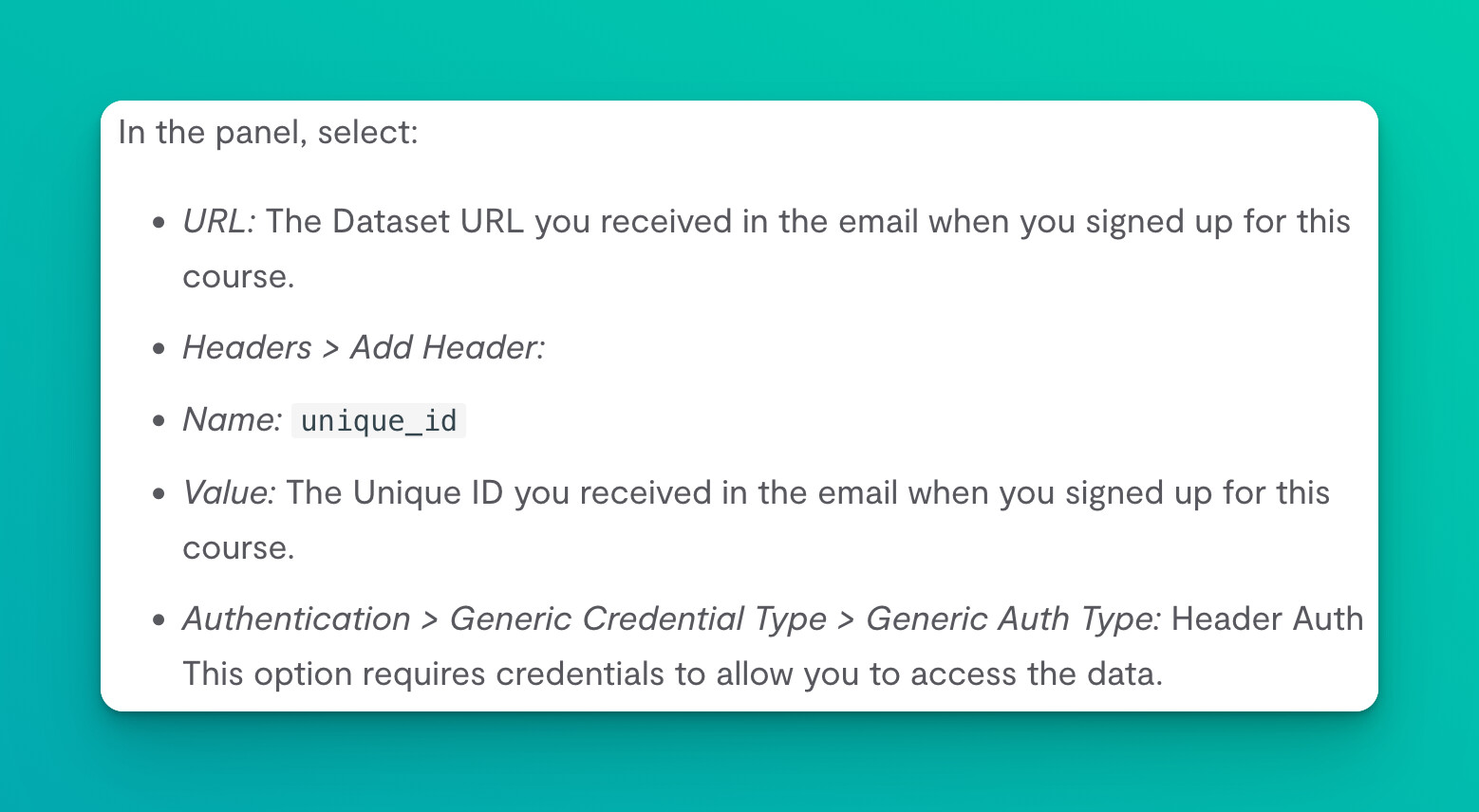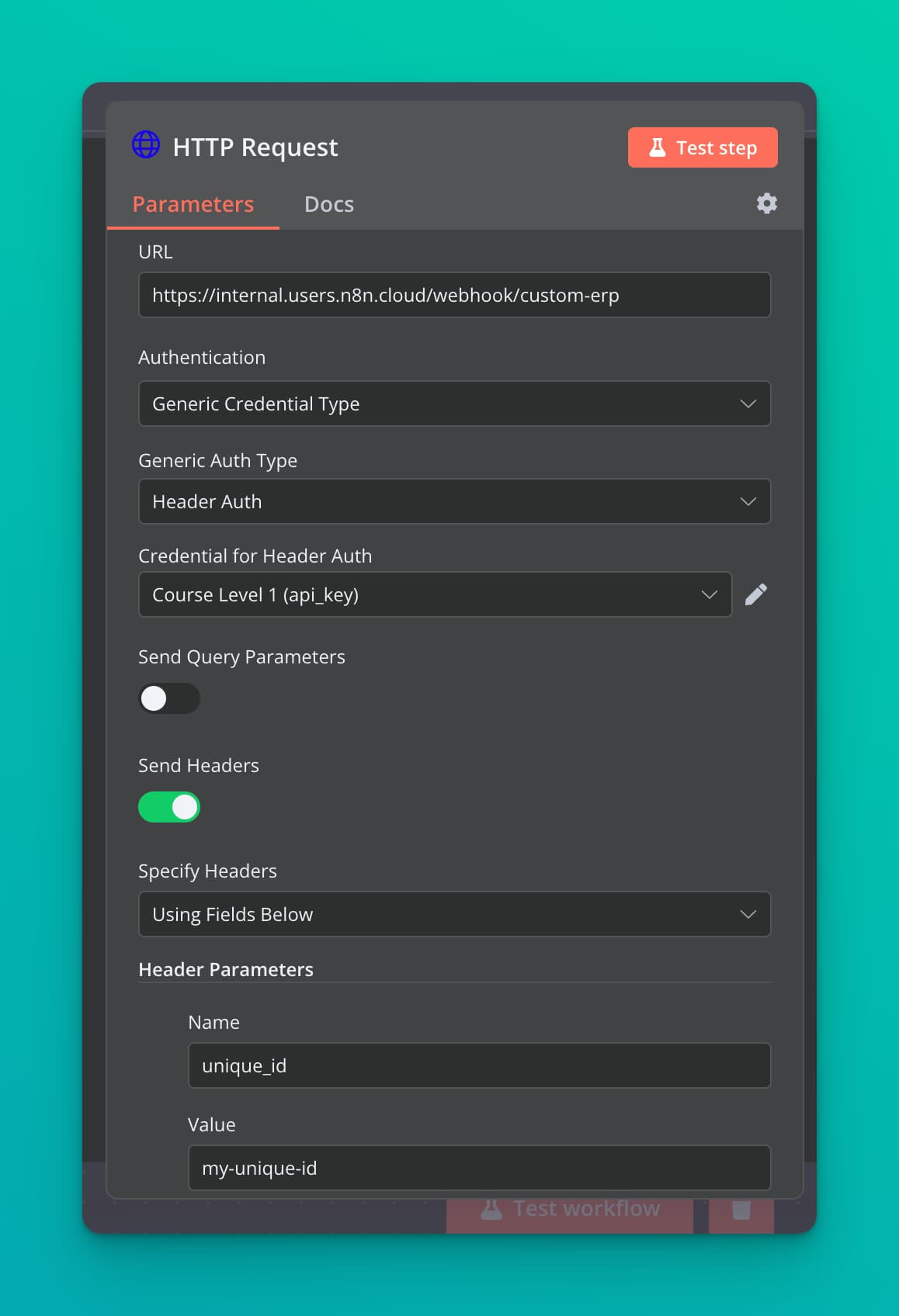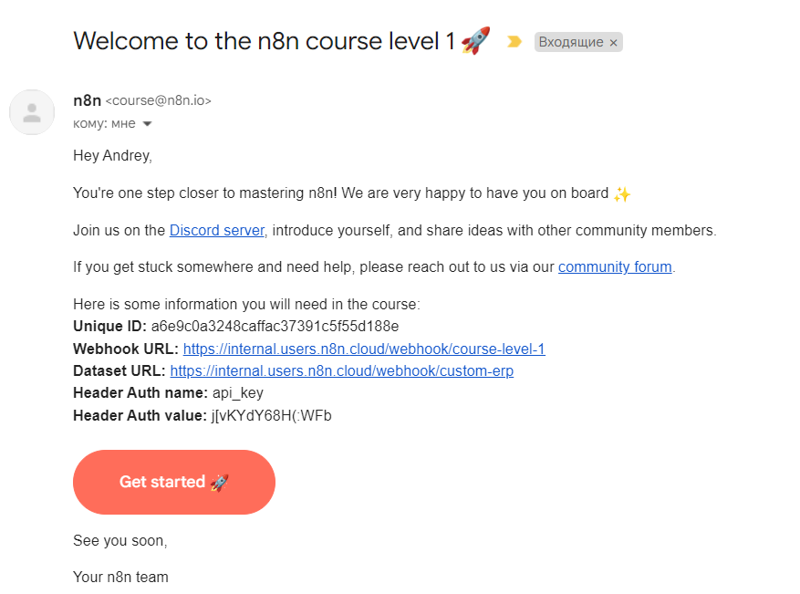 As you can see in the attached screenshot from n8n couse-level-1 Welcome e-mail, Unique ID is a 32-character string, but Header Auth value is a 15-character string, so they values are different. {{ $(‘HTTP Request’).params[“headerParameters”][“parameters”][0][“value”] }} returns Header Auth value, but Discord channel bot allows only messages with Unique ID, and drops them otherwise.