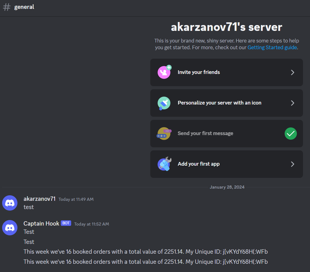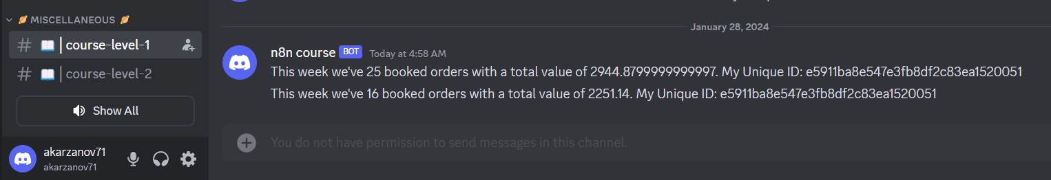 So I hard-coded Unique ID value from the e-mail received from n8n and this time the message has succesfully showed up on n8n course-level-1 channel.