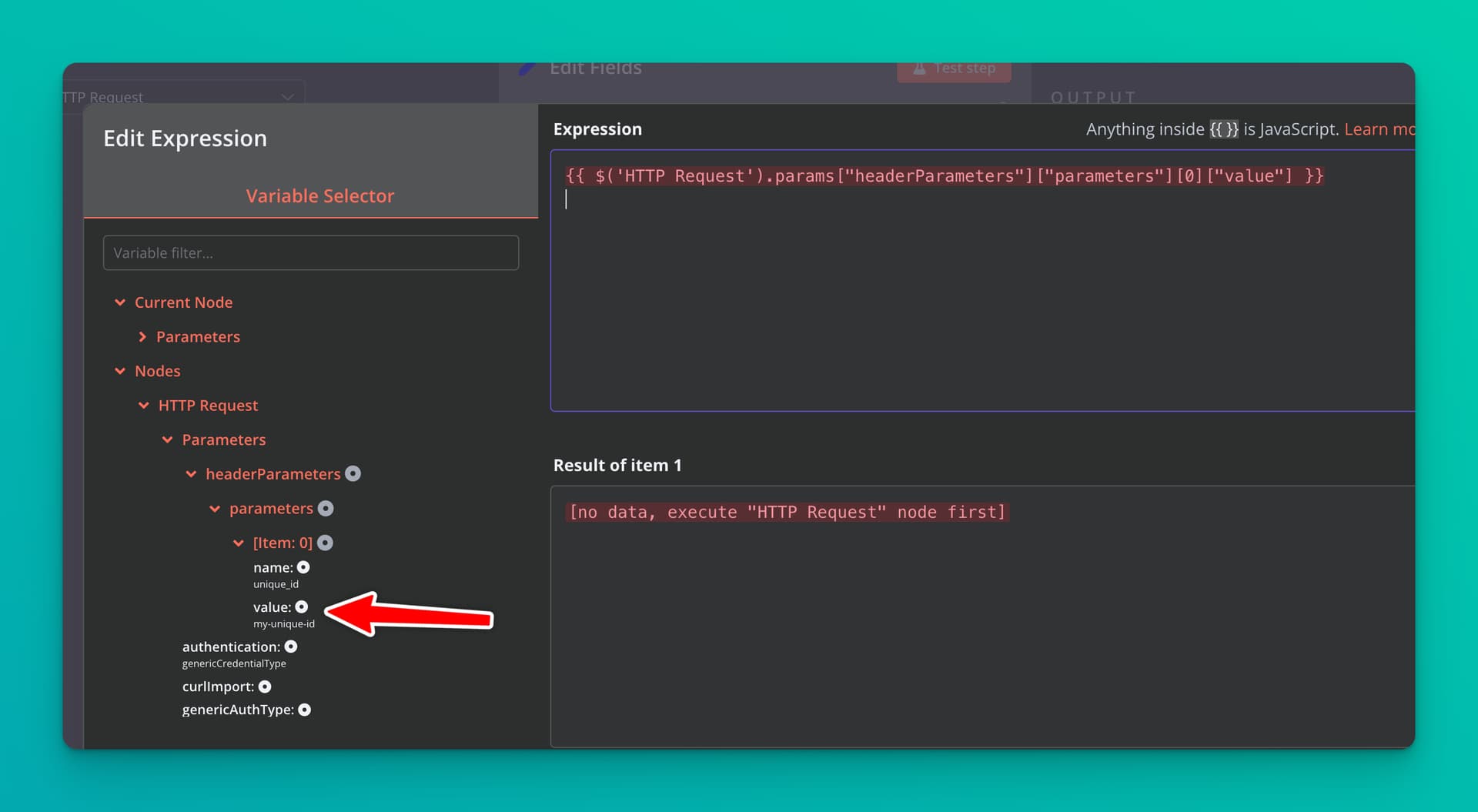 The idea is to use the value inputted as a header parameter here and the path for that is {{ $('HTTP Request').params["headerParameters"]["parameters"][0]["value"] }}