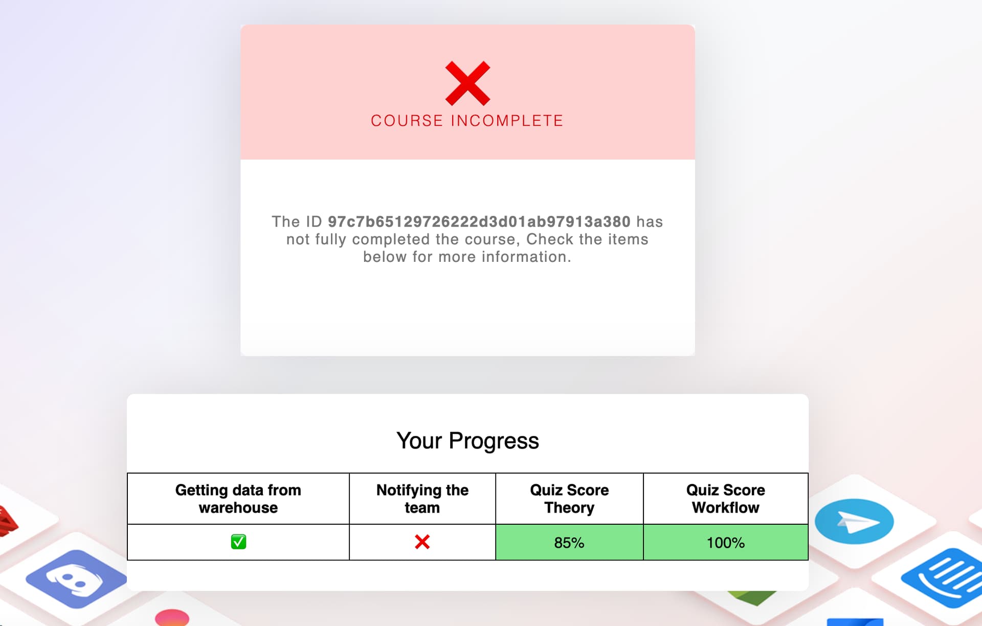 97c7b65129726222d3d01ab97913a380 Hi thats my Unique ID, but the course completion still shows incomplete even though I’ve done the entire workflow.