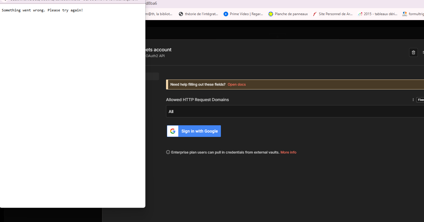 When I click on “Sign-in with Google”, this error is showing. I have tried almost everything. It is not happening on my other n8n instances with the same email. It’s only happening in this instance. I am trying to connect google sheets. Please someone suggest whats the solution or what needs to be done. Am I doing something wrong? Or is it a backend issue?