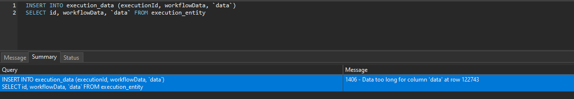 After changing the column directly on the database to match the column on execution_entity (mediumtext) the query ran successfully. However the migration keeps failing…