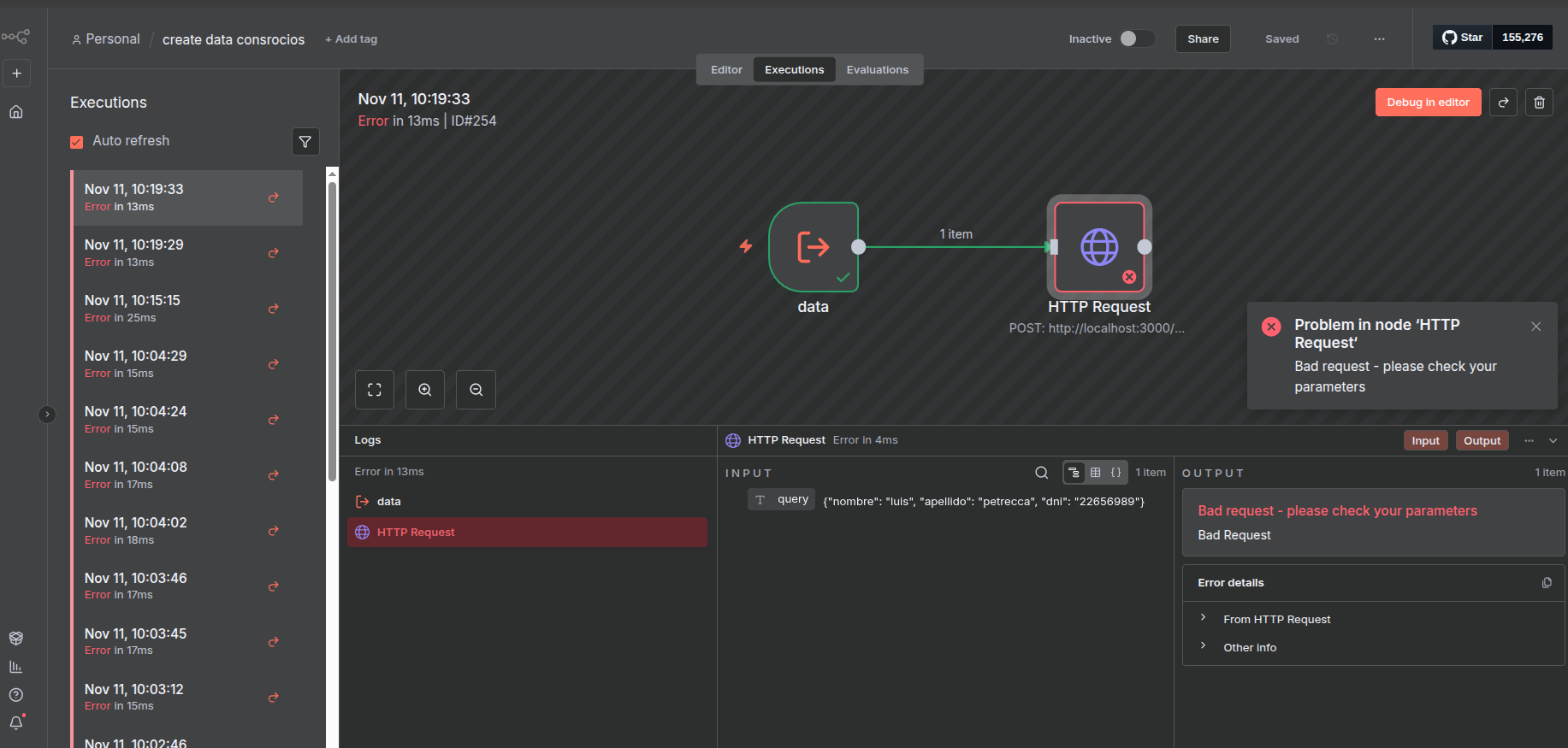 So, as I can see on the http request node, you are trying to post data to your localhost:3000. This will work only if your n8n is also hosted locally (localhost will point to your local machine). It will fail if you are using cloud service or running the tool in Docker - in these cases localhost is the server the cloud runs on or the docker container.