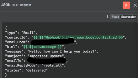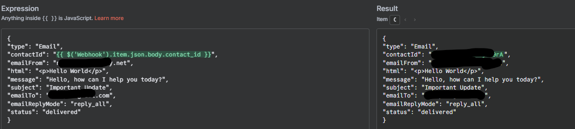 However, once I try to add variable in the “html” field: (which seems to be the body of the email not message) like so: