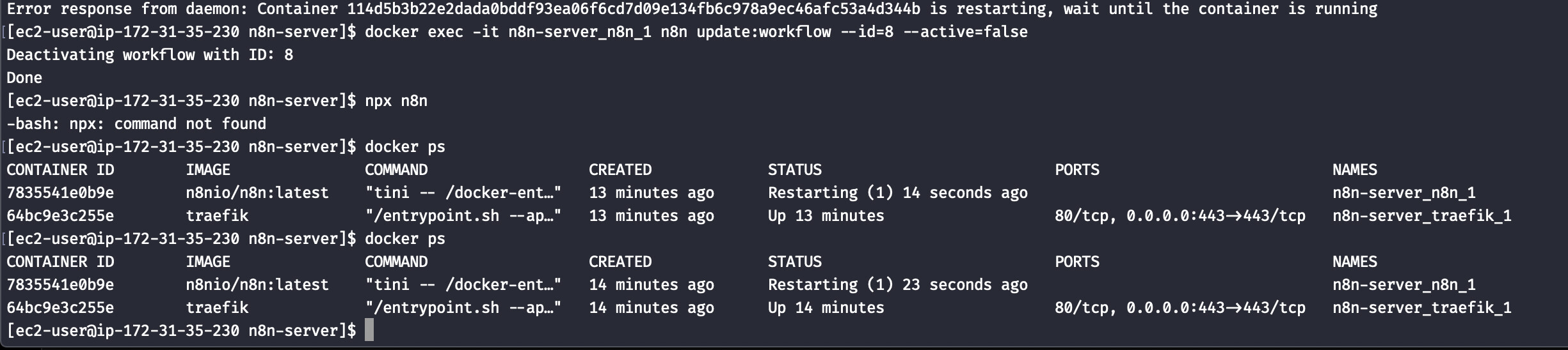 As you can see in the image, I was basically spamming the docker exec command to make the command go through and was successful in doing so, but the image is still restarting