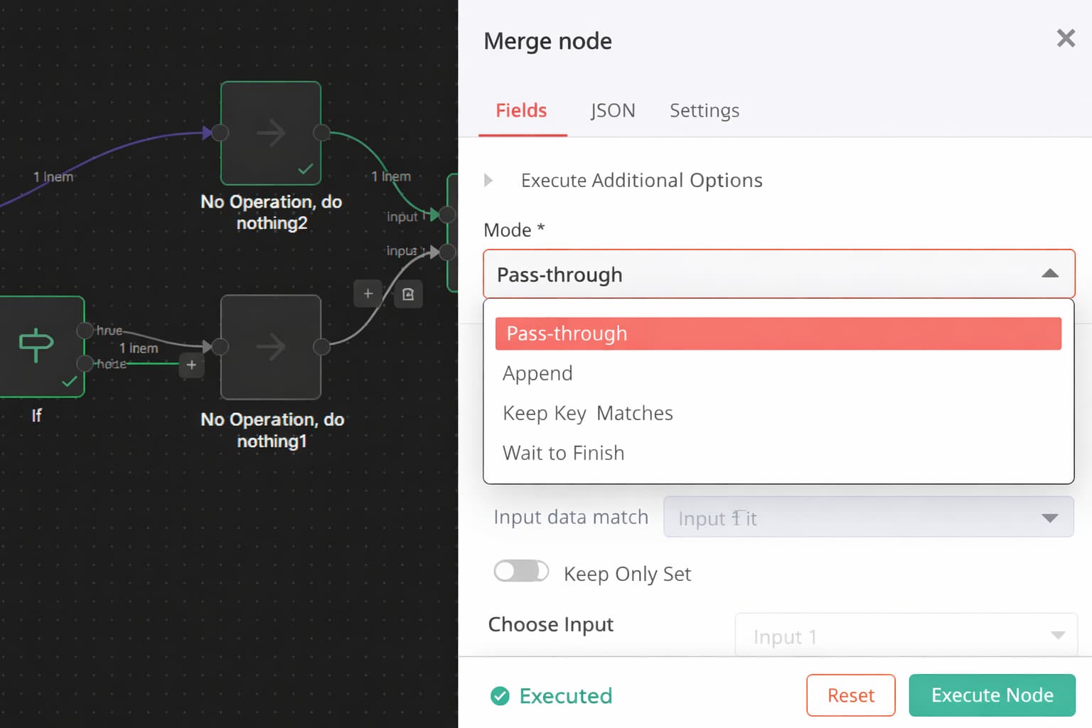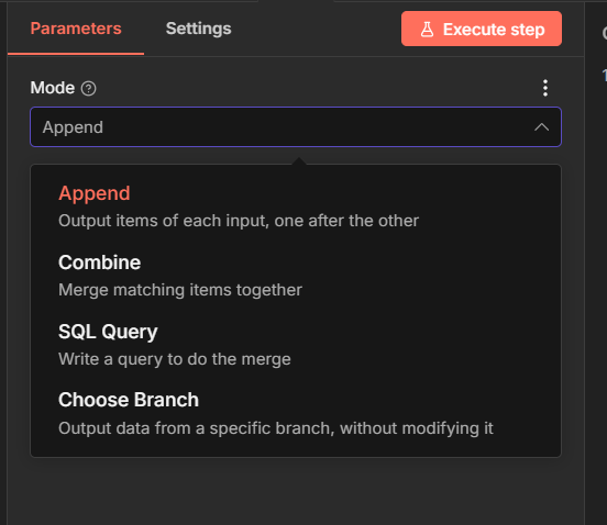 According to the n8n documentation, the Merge node always waits for both inputs to execute, regardless of using Append. The mode only controls how the data is combined, not whether one input can be skipped. In Append, items from both inputs are simply concatenated, but the node still requires execution from both sides; if one branch doesnât run, the Merge will not produce output.