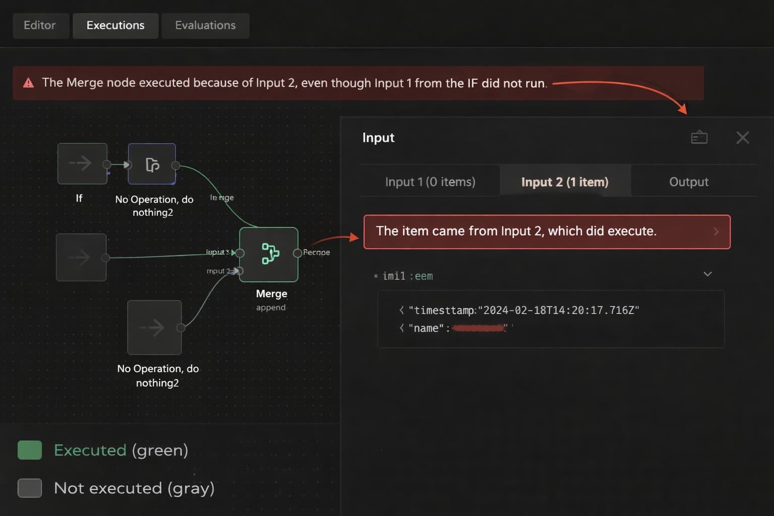 Could you please confirm in the execution view whether both Input 1 and Input 2 actually executed (turned green)? That will help confirm what is happening in this case.
