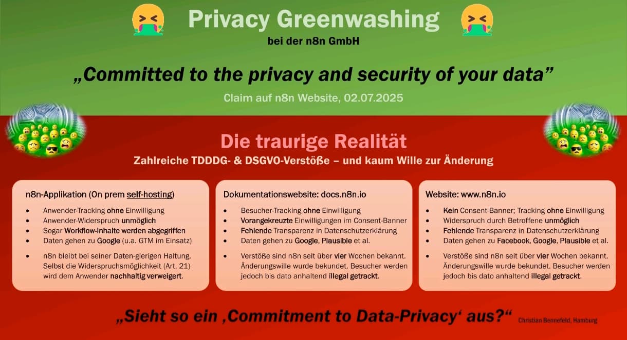 Advertising with “Privacy for your Data” while deliberately tracking users and consistently violating the GDPR: That’s n8n from Berlin.