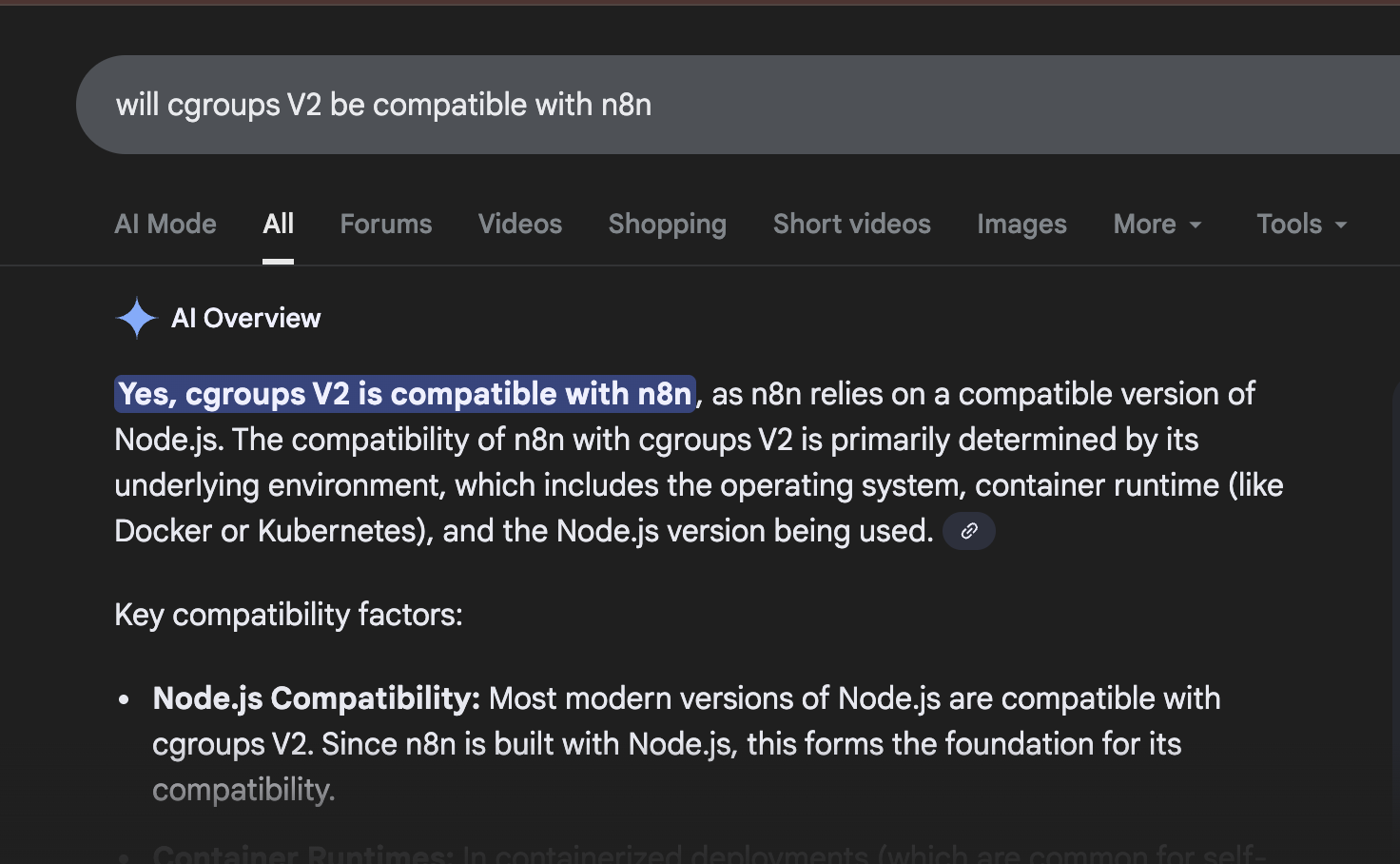 We are using n8n on our openshift. we are using n8n pod which now uses version 1.109.2 image. we got news from our cluster admins that next year they would migrate to openshift 4.19. before that they would remove cgroups v1 from clusters and only cgroups v2 would be there. please tell all the possible ways to know the compatibility of n8n pod in this scenario