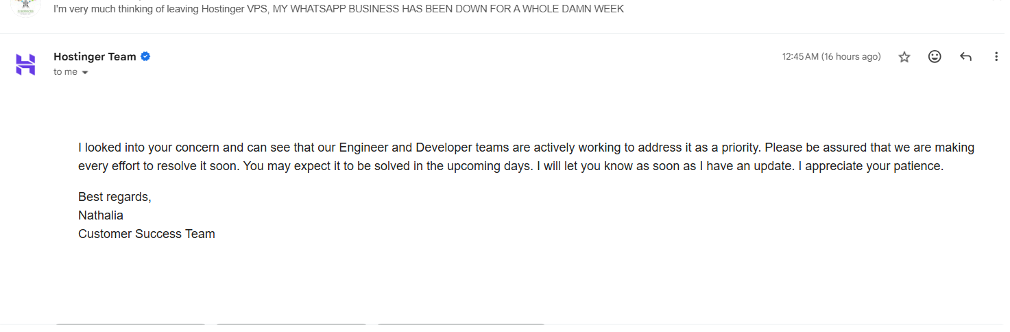 I’ve decided I’m moving to Elestio. I followed using Hostinger because I saw many Youtubers recommended. Had a long talk with Claude and it has not reported any issues with Elestio and WhatsApp triggers unlike Hostinger and yes Hostinger is not keeping us updated with the situation and it is truly frustrating.