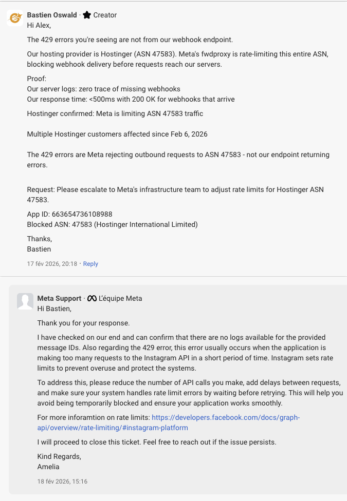 I’ve already resolved the issue. In short, yes—it has been confirmed that this is a Hostinger-related problem. Here’s a temporary, low-cost, and quick workaround you can use: Solución: Webhooks de Meta (WhatsApp) con Timeout o Retraso en Hostinger (Rate Limiting ASN 47583) - Azul School