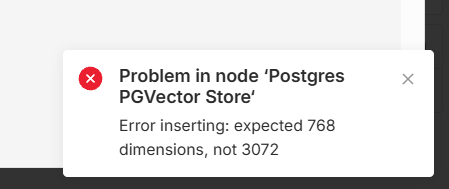 Looking at your error screenshot, it confirms what’s happening: the embedding model is outputting 3072 dimensions but your table expects 768. So the model itself is definitely producing 3072-dim vectors regardless of what the n8n UI says the “default” should be. Your table at 3072 was actually correct for storage, the retrieval issue is probably a config mismatch somewhere in the agent setup. For text-embedding-005 if you want to try that route, Google’s docs say it outputs 768 dimensions by default so that should work with a 768 table, just make sure you use the same model for both store and retrieve.