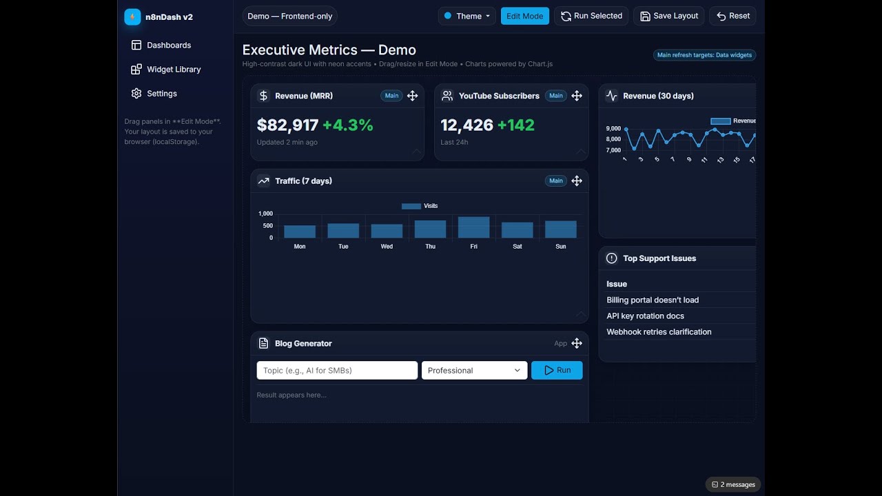 Whether you’re helping clients, supporting family, or optimizing your own workflows — this tool will allow you to build custom dashboards that bring together n8n automations, widgets, and live data in a single beautiful interface. Think of it like a command center for your digital life!