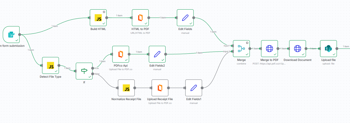 the flow is Form > Build HTML > HTML2PDF > File Upload.