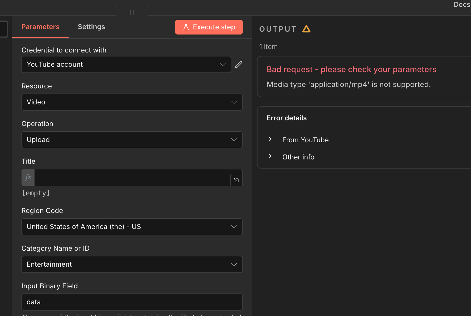 i had a working flow: read file from my local downloads folder, upload to youtube node, pretty straight-forward. I have a local docker set up, and before between these two nodes, I have a code node basically doing `item.binary.data.mimeType = ‘video/mp4’;`, and that was working.