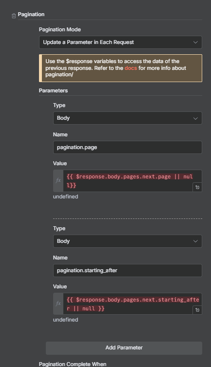but unable to know how exactly to pass these in pagination of HTTP Node.