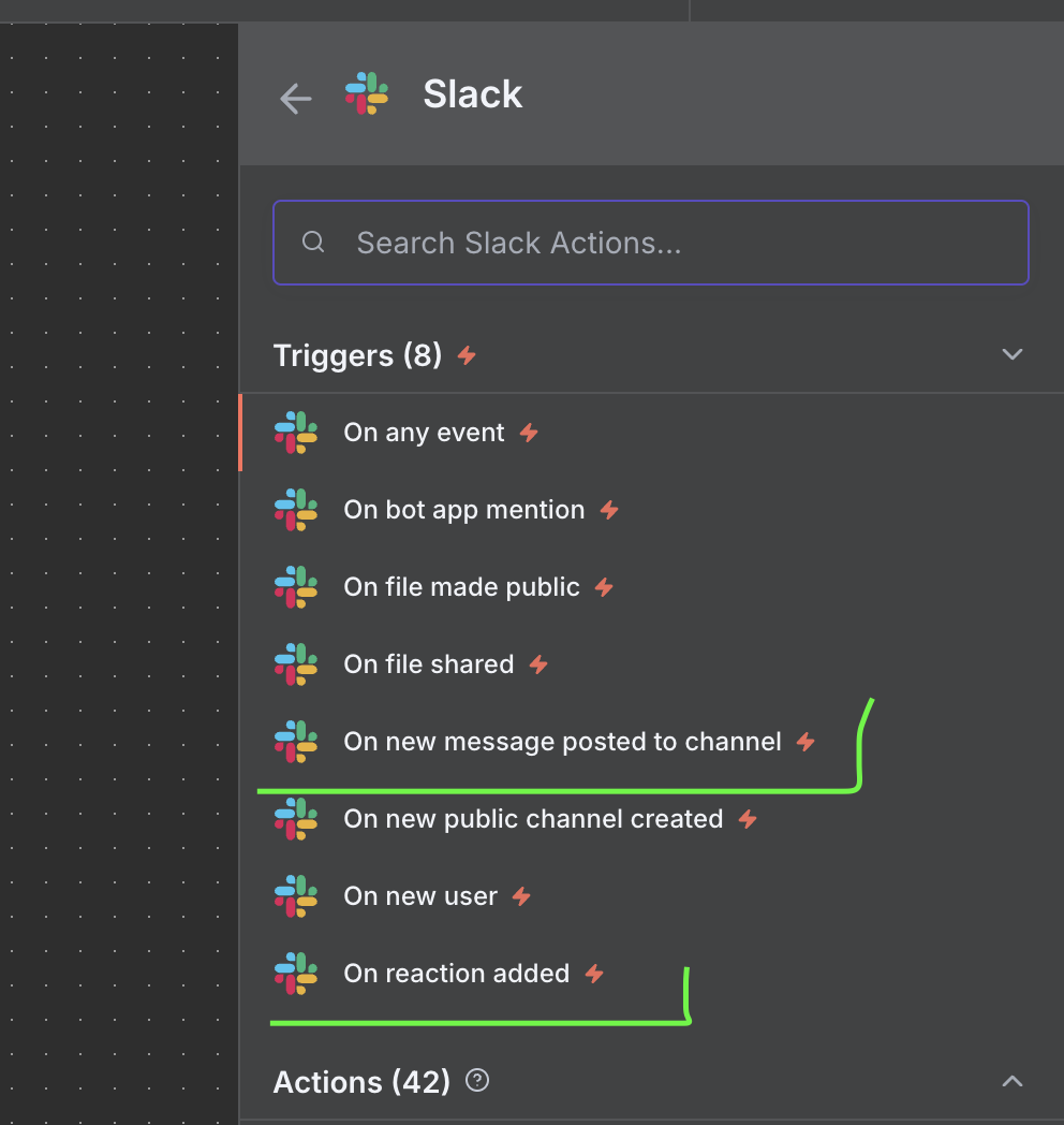 on reaction added is to watch for any reaction emoji to the message, and on new message posted is to watch for any “urgent” messages