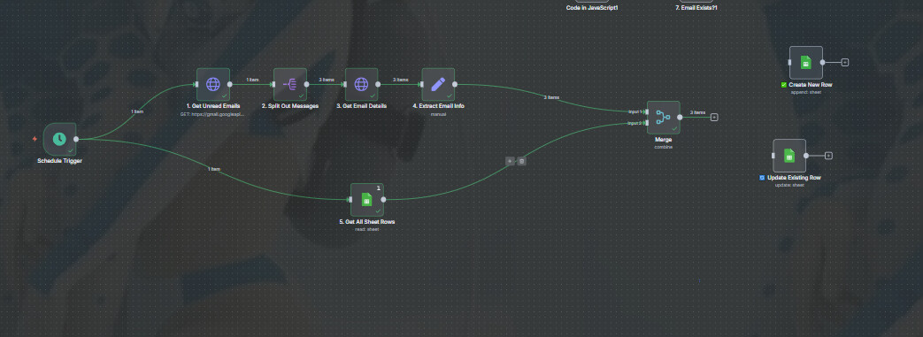"jsCode": "// Input 1: The new emails (comes in as 'items')\n// Input 2: All the rows from your Google Sheet (we get this from the other node)\nconst sheetItems = $('5. Get All Sheet Rows').all();\n\n// Create a simple, fast lookup map of all the emails that already exist in the sheet.\n// We store the whole row, which is more powerful.\nconst sheetEmailMap = new Map(\n sheetItems.map(item => [item.json.Email.trim().toLowerCase(), item.json])\n);\n\n// This will be the final output of this node\nconst finalItems = [];\n\n// Loop through every new email\nfor (const item of items) {\n const incomingEmail = item.json.Email.trim().toLowerCase();\n \n // Look up the incoming email in our map of sheet emails\n const matchedSheetRow = sheetEmailMap.get(incomingEmail);\n\n if (matchedSheetRow) {\n // MATCH FOUND!\n // A row with this email already exists.\n // We will merge the sheet data (like 'row_number') into our item.\n // This tells the IF node that the item exists.\n Object.assign(item.json, matchedSheetRow);\n }\n\n // Add the item (now with sheet data, if it was found) to our results.\n finalItems.push(item);\n}\n\n// Return all the processed items.\nreturn finalItems;"