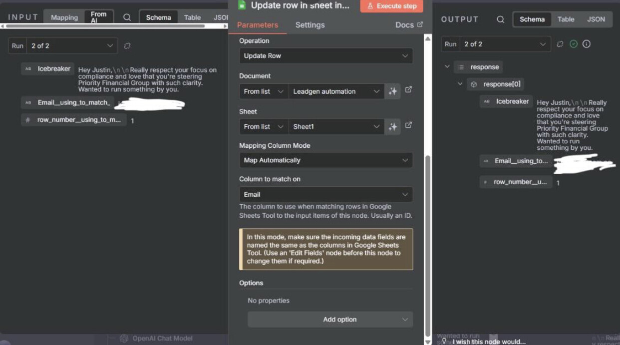 I needed to double check my parameters. After making a few adjustments, the workflow is running smoothly. However, I’m still having trouble with the icebreaker column not getting populated. Any suggestions?