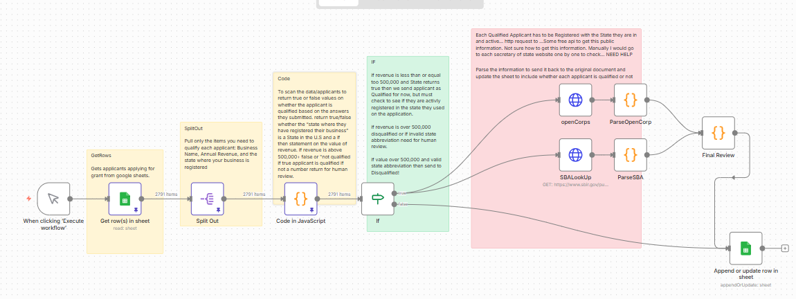 Im new to N8N and automating workflows but Im determined to learn and asking from people with experience to mentor me to be great at this. I built a Grant Scrubbing Agent for a friend but this is technically my first use case and I want to build credibility and knowledge so I took on the task of trying to learn this on my own. Im very frustrated because I dont understand the Http Request node or how I could get this workflow to work. I have attached my workflow: