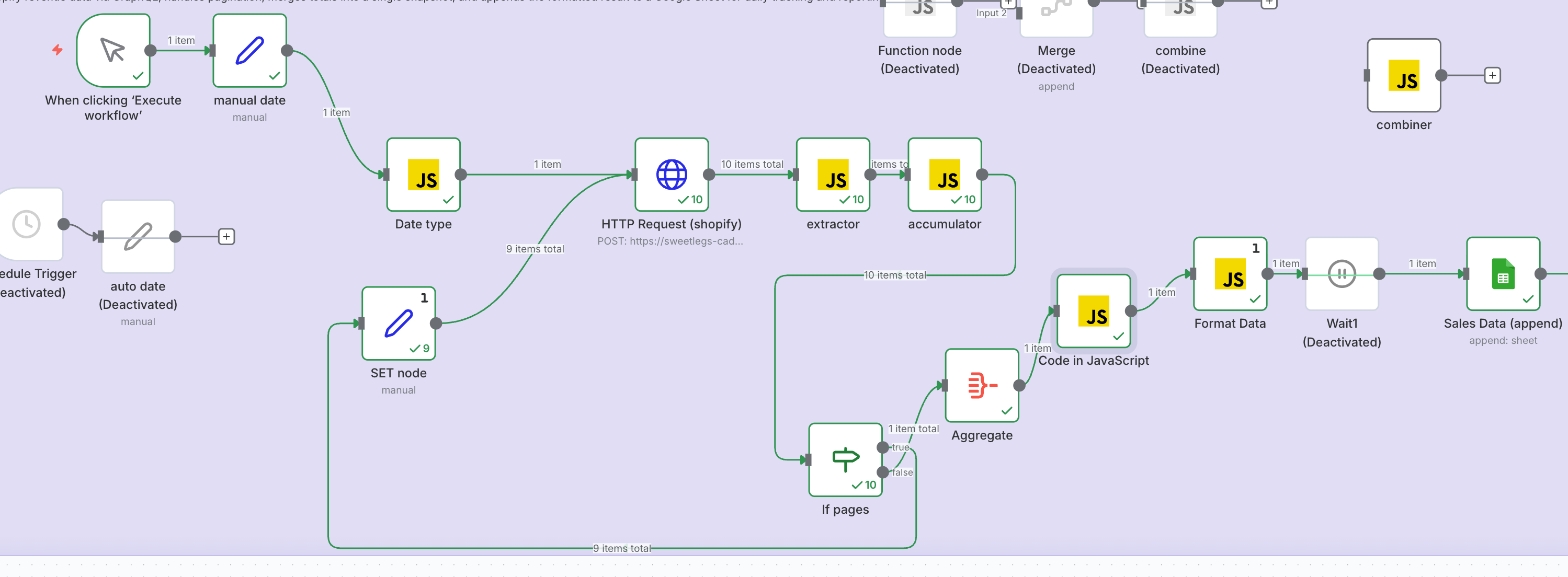 have spent 10+ hours beating my head against the wall for a shopify reporting workflow. in a nutshell it pulls orders from a set date from shopify through http request, organizes them by tag and outputs it in a readable tag ie customer, wholesale, total etc. the workflow WORKS, until theres more than 250 orders, thats the shopify limit with http request. after that ive tried to add a pagenation loop, I DID THAT, i get the 9 or 10 pages / items in the loop and can verify all the data. how do i merge the 10 items / pages to add up all the data? i have tried accumulating, aggrigating, functions, merging, i cant get anything to work. ai taking me in circles. Any finger pointing in a direction would be helpful. thanks in advance.