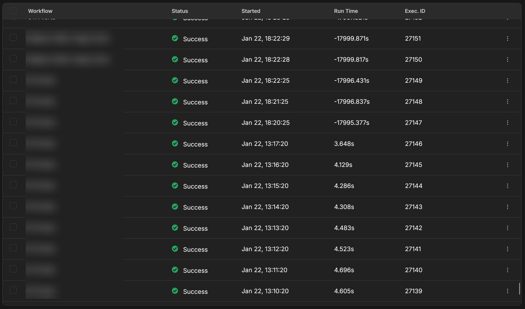 The key detail is that the negative runtimes are very consistent at about -18,000 seconds, which is almost exactly 5 hours. There’s also a clear cutover point in time: executions earlier in the day have normal runtimes (3–5 seconds), and executions after that point suddenly show large negative values.