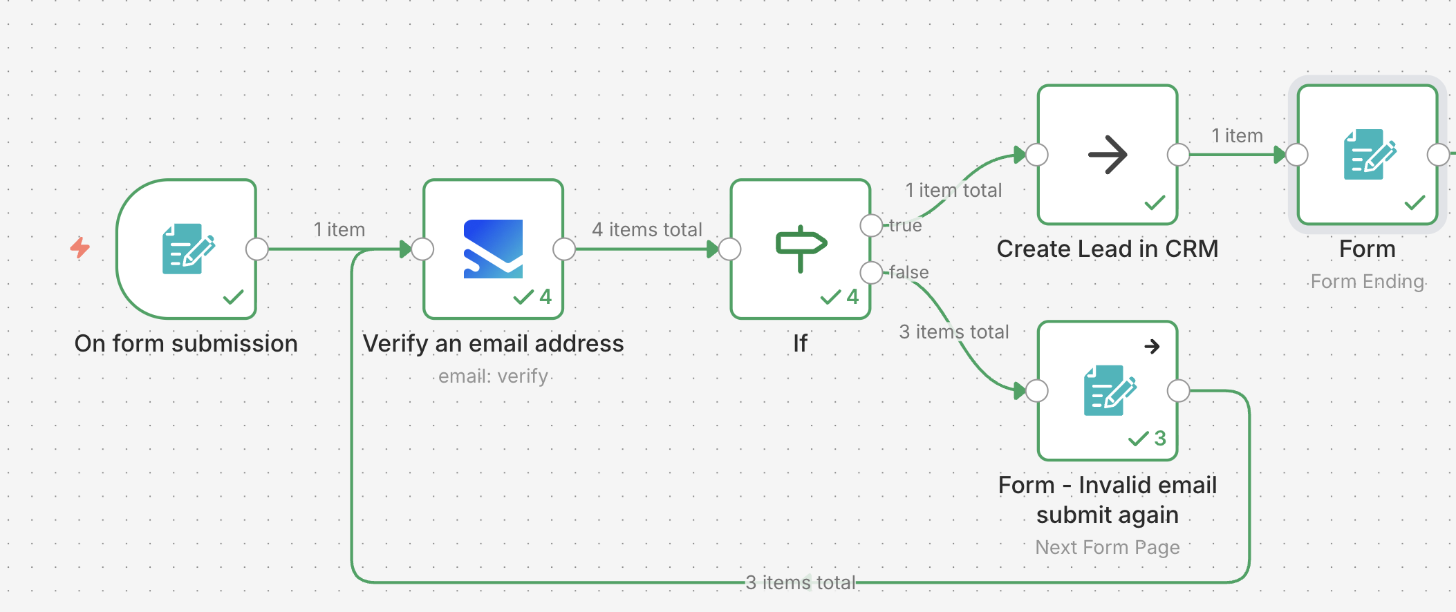 Verification: Uses NeverBounce to check every email submitted via an n8n Form.