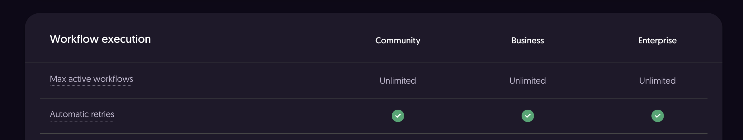 I Must be missing something, because all I see on the business plan pricing (self host) is unlimited steps per workflow, not unlimited workflows.
