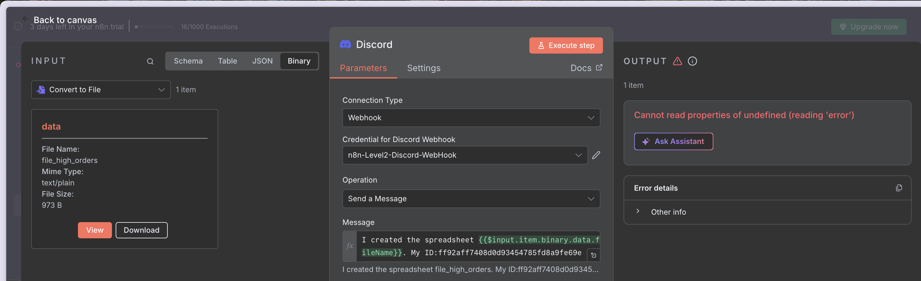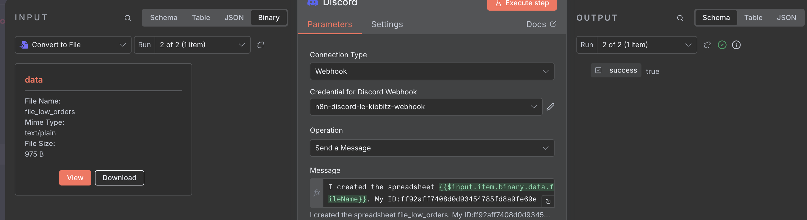 When I use the same credentials in the bottom part of my Workflow, in the Loop and after ‘Convert to file(csv)’ node, the Discord node doesn’t do the job.