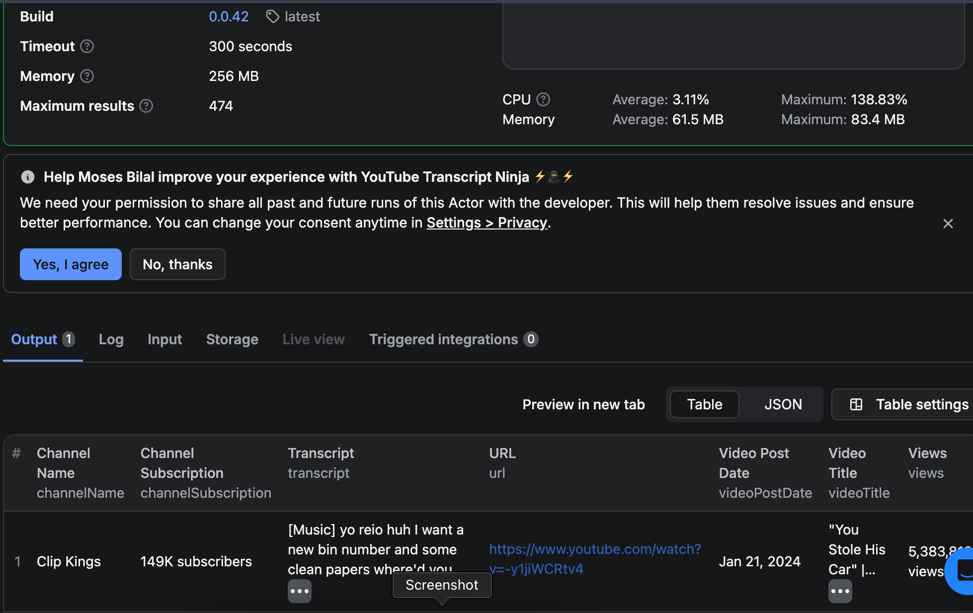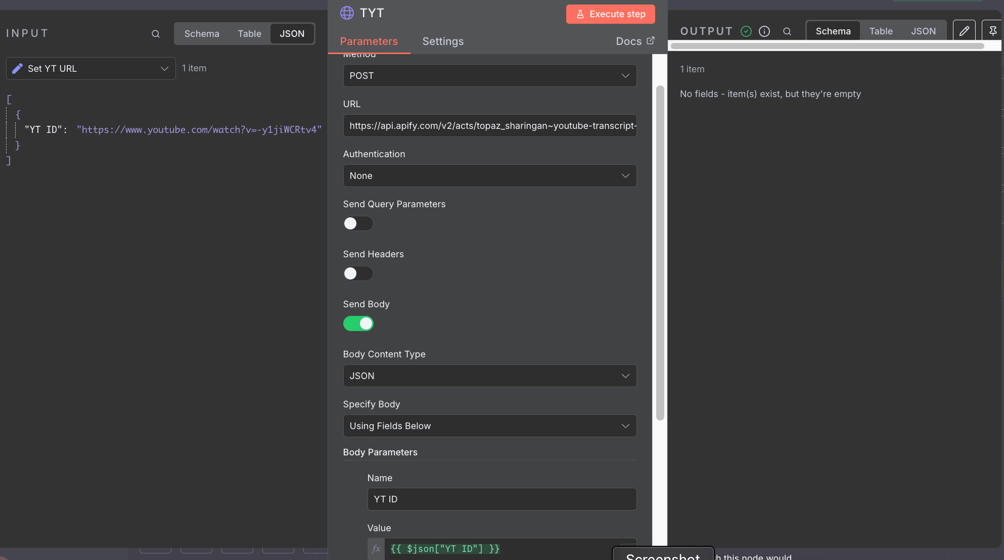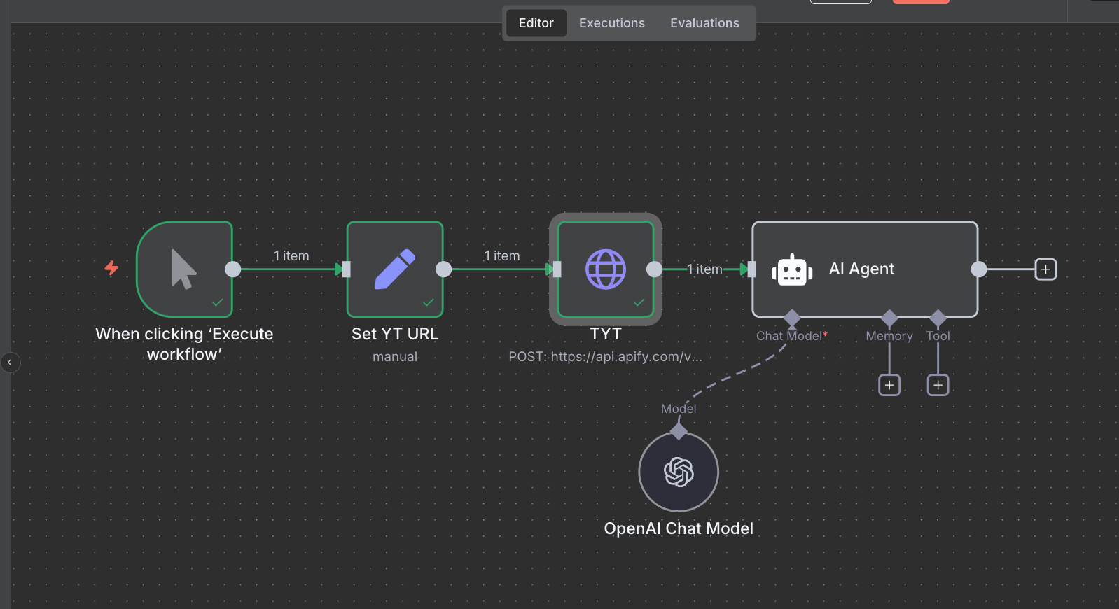 I am trying to get this workflow set up so the agent can summarize a youtube video from the transcript. The run will execute but not show any data in the output section. When I look in Apify, it shows it was run sucessfully and the transcript is pulled…Anyone have any ideas on why I do not have any output date?