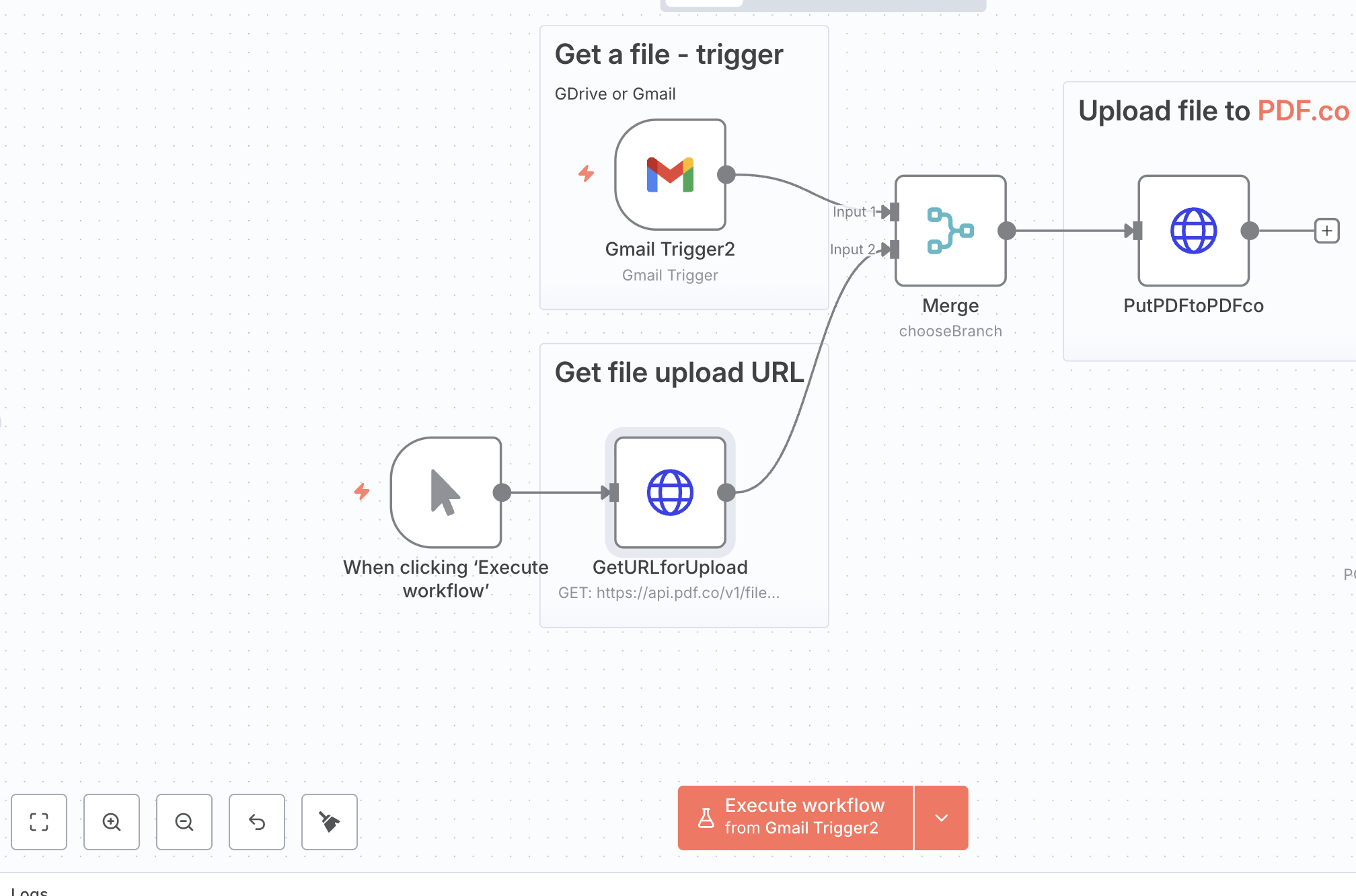 I’m running a gmail trigger to push a pdf “binary” file and a get url node into a merge node. I need somewhere to store the pdf temporarily. I saw this work on a training video and can’t seem to replicate this step because I’m being asked to choose one execution over the other. I’m not sure if a newer update caused this or if there is a work around. Here is a screenshot of what I have so far.