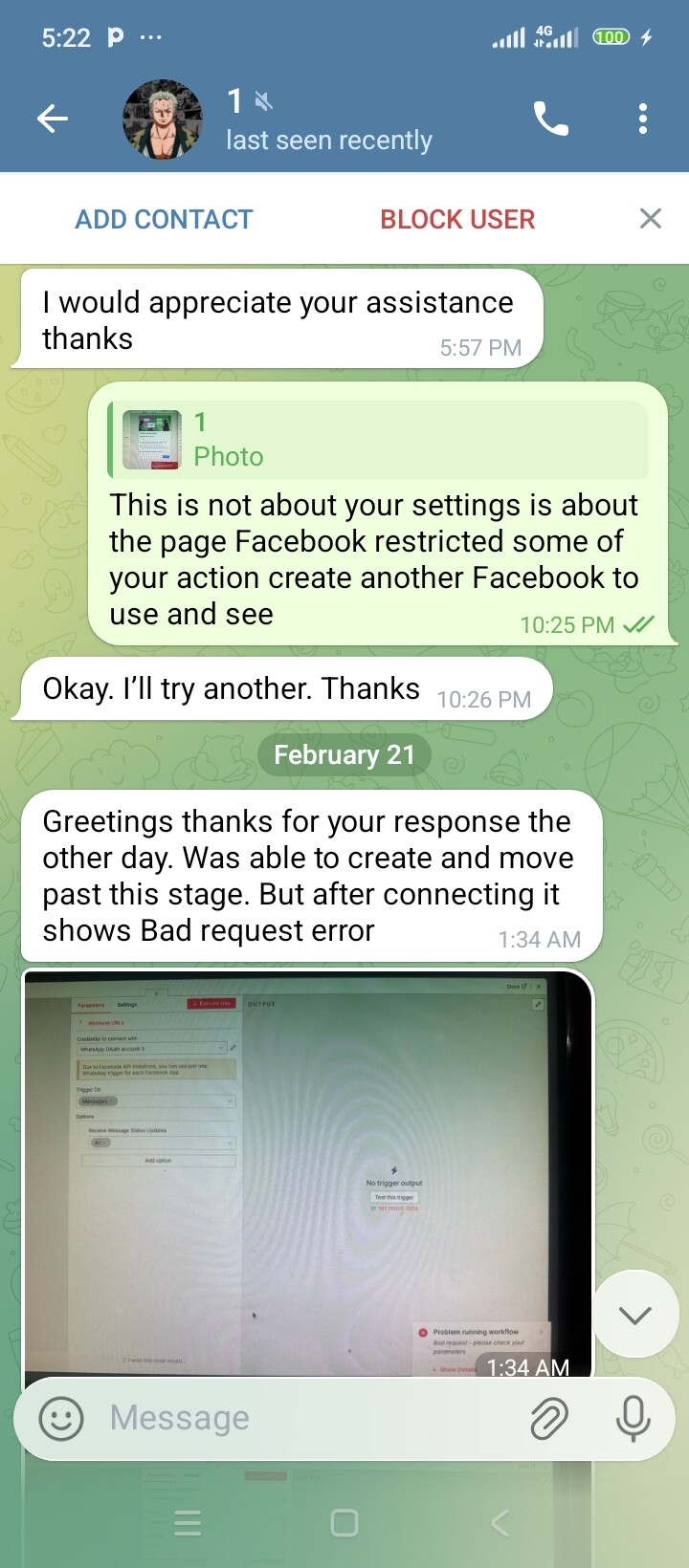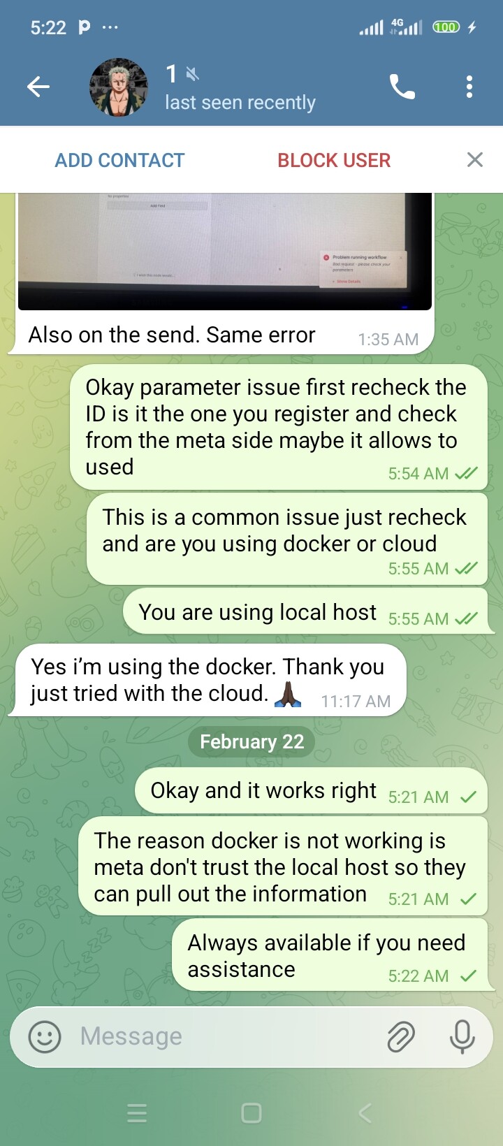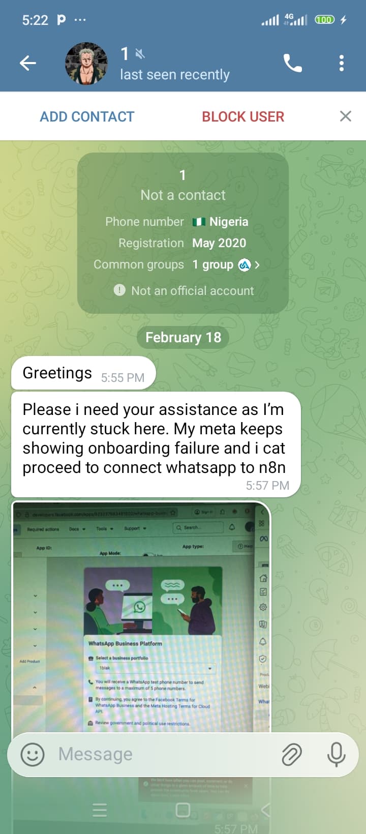 He was building a WhatsApp automation using n8n and the Meta WhatsApp Cloud API.