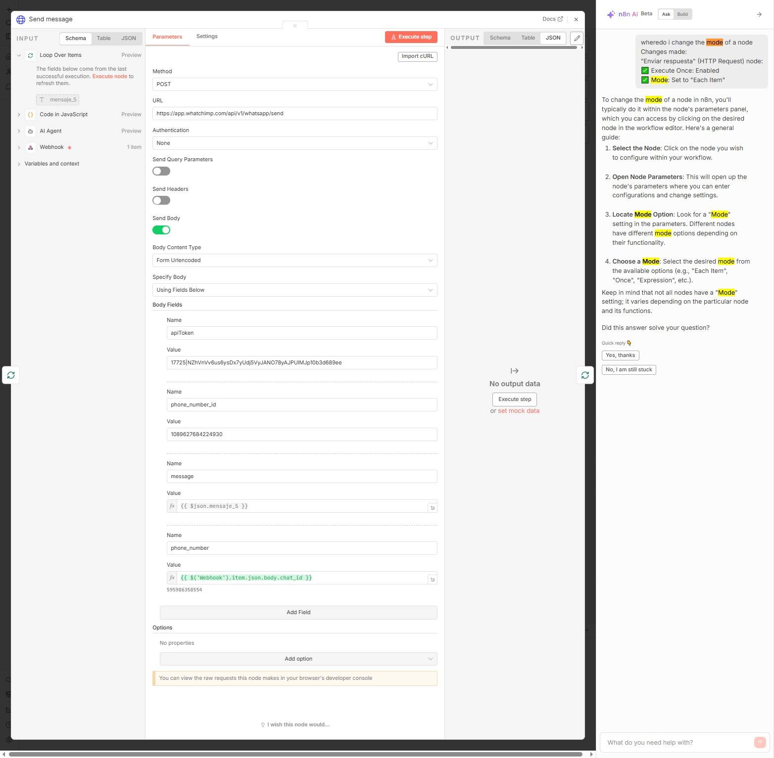 Mode: Set to “Each Item” How it works now: The “Expandir mensajes” node creates individual items from the array The “Enviar respuesta” node processes each item one at a time Each HTTP request waits for the previous one to complete before starting Messages are sent in the exact order they appear in the array This ensures that: Message 1 sends → waits for response → completes Only then Message 2 sends → waits for response → completes And so on… The sequential processing prevents overwhelming the WhatsApp API and maintains the correct message order. Would you like any other adjustments? Restore version · Feb 10, 20:15