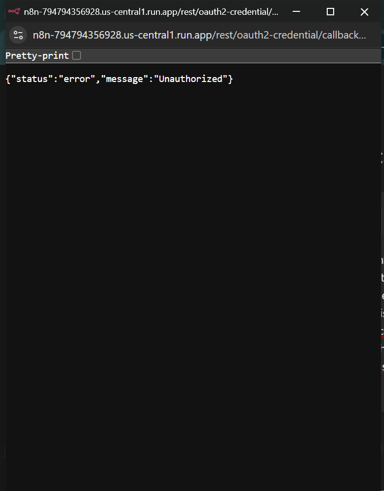 I’m running self-hosted n8n on Google Cloud Run and trying to integrate it with Google OAuth to authenticate and access various Google APIs (e.g., Google Drive, Google Sheets) and trying to create n8n credentials and potentially using those credentials in n8n google nodes like google docs, spreadsheet, drive, etc. I have set up OAuth credentials and the OAuth consent screen in the Google Cloud Console. However, when I try to authenticate with Google via n8n, I am prompted to choose my Google account, where I choose the same account using which I created the credentials and after doing so, I encounter the following error message: